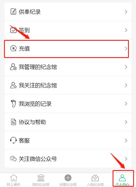 目前仅支持微信支付,后期会根据客户需求开放更多等支付方式,敬请期待。用户进行纪念馆后->个人中心(点击充值)进行充值。